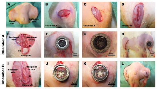 AV loop preparation. (A) Shaving and disinfection of the donor as well as recipient sites. (B) For chamber A surgical preparation, a small horizontal incision is applied to open the skin. (C) For chamber B the skin is opened by a vertical incision. (D) Next, the donor femoral vein is exposed and carefully separated. (E) AV loop preparation for chamber A. (F) After positioning a loop in chamber A (partially filled with GelMA), the skin is retained in the grove, and the chamber is fastened to the skin using a purse string fixing technique. (G) Placement of the glass window with a snap ring and chamber installation. (H) Top view of the surgical site following the AV loop procedure. (I) AV loop preparation for chamber B. (J) Placement of the loop in the partially GelMA-filled chamber B. (K) Placement of the glass window. (L) Top view of the surgical site after subcutaneous installation of chamber B. ‡‡: microsurgical anastomosis; scale bar: 5 mm.