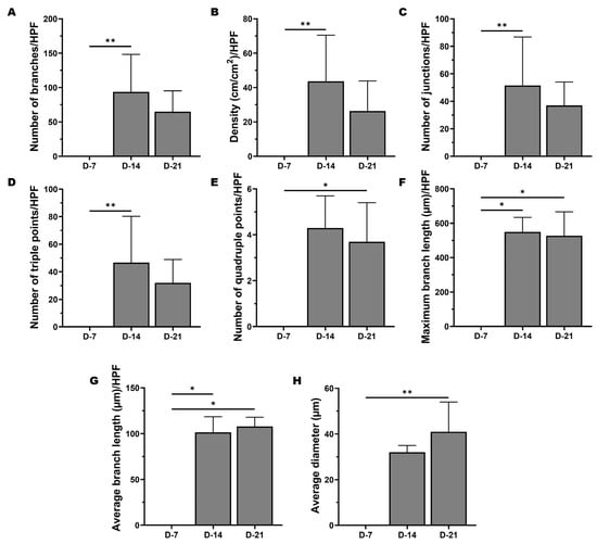 Chamber B IVM analysis. (A) Number of branches. (B) Density (cm/cm2). (C) Number of junctions. (D) Number of triple points. (E) Number of quadruple points. (F) Maximum branch length. (G) Average branch length (μm) per HPF and (H) average vascular diameter (μm) were calculated. Data are presented as medians with interquartile ranges. Significance at * p < 0.05 and ** p < 0.01.