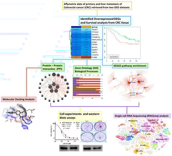 Colorectal cancer (CRC) is the second most common cancer, with continually reported cases and high mortality globally [1,2]. CRC is a heterogeneous disease with varying molecular characteristics and clinical outcomes in patients; consequently, the cancer is diagnosed in an advanced stage, and approximately 25% of patients present with localized or distant metastasis [3,4,5,6]. Amongst the most common clinical phenotypes of CRC are cancer stemness angiogenesis, resistance to chemotherapy, and metastasis [7,8]. Despite advanced molecularly stratified therapeutic interventions, including resection surgery, radiation, chemotherapeutics, and targeted therapeutics, the 5-year overall survival rate is still limited in CRC and is only 12% for metastatic (mCRC) patients [9,10,11]. In addition, submucosal invasion was reported to metastasize to lymph nodes in more than 10% of CRC cases [12]. Moreover, several studies have shown that CRC patients’ deaths were associated with liver metastasis; however, the mechanisms leading to cancer metastasis still remain to be fully explored [13,14,15,16].