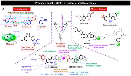 Chemical synthesis of the Novel Multi-Target small molecules NSC828787 (LCC09) and NSC765689 (LCC-21): (A) several novel series of 5-(2′,4, -difluorophenyl)-niclosamide derivatives based on difluorobiphenyl and niclosamide scaffolds, and (B) novel small molecule LCC-21 and LCC-09 consisting of magnolol, 2,4-difluorophenyl, and niclosamide functional fragments.