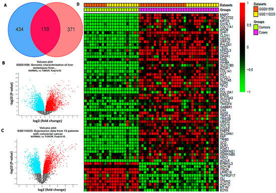 Microarray data mining of gene expression profiling in colorectal cancer (CRC). (A) Venn diagram showing overlapping genes obtained from the GSE81558 and GSE3110223 microarray datasets. (B,C) Volcano plots showing downregulated and upregulated genes in normal and tumor samples, respectively (at p < 0.05). (D) shows the heatmap of overexpressed overlapping genes in CRC.