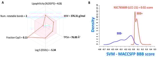 The pharmacokinetics (PK), drug-likeness, absorption, distribution, metabolism, and excretion (ADME) of NSC765689 were assessed using the SwissADME bioinformatics tool (http://www.swissadme.ch/ 23 May 2022) [70]. The criteria used for drug-likeness in drug discovery was evaluated based on the Lipinski (Pfizer) rule-of-five [71]. Furthermore, we predicted the blood–brain barrier (BBB) by utilizing the online (BBB) Prediction Server (https://www.cbligand.org/BBB/ 23 May 2022) [72]. To analyze further, we predicted the target genes for NSC76589 compound by using the Swiss target prediction tool (http://www.swisstargetprediction.ch/ 23 May 2022). The data used were collected from different public servers, including ChEMBL and PubChem, and all predictions were based on “probability” obtained from the target score to assess the plausibility of the predicted target being accurate [73].