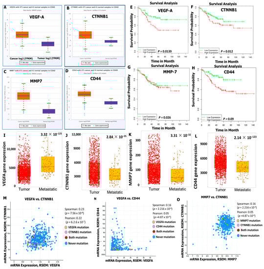 Our computer-based analysis revealed that the messenger (m)RNA levels of VEGFA, CTNNB1, MMP7, and CD44 oncogenic signatures were upregulated in tumor samples compared to normal samples of patients with CRC tissues, with significant p values (<0.05) (Figure 5A–D). In further analyses, we found that the high expression levels of VEGFA/CTNNB1/MMP7/CD44 signatures were associated with significantly shorter survival times compared to those of patients with lower expression levels of these oncogenes (Figure 5E–H). Furthermore, we explored the TMN plot to compare VEGFA, CTNNB1, MMP7, and CD44 oncogenes in tumor and metastatic CRC samples from RNA sequencing data (RNAseq). Using the Kruskal–Walls test to compare data, we found that overexpression of VEGFA, CTNNB1, MMP7, and CD44 genes promoted primary tumor and cancer metastasis in CRC tissues (Figure 5I–L). We further investigated the correlations among VEGFA/CTNNB1/MMP7/CD44 signatures and found that, when all four oncogenes were combined for analysis, the predicted results showed positive correlations in the range of r = 0.16~0.27 of VEGFA with CTNNB1 and MMP7 in CRC patients (Figure 5M–O), with positive Spearman and Pearson correlation coefficients and p < 0.05 considered statistically significant.