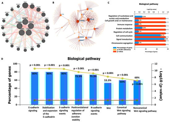 Correlation analysis network among Vascular endothelial growth factor-α (VEGFA)/beta catenin (CTNNB1)/matrix metalloproteinase (MMP)-7/cluster of differentiation 44 (CD44) oncogenic signatures. Protein–protein interactions (PPIs) are displayed after considering the gene neighborhood, gene co-occurrence, and co-expression of the clustering network. (A) Gene–gene interactions (GGI) between VEGFA with CTNNB1, VEGFA with MMP7, VEGFA with CD44, CTNNB1 with MMP7, CTNNB1 with MMP7, and CD44 with MMP7. (B) KEGG pathway enrichment analysis from signaling network analysis. (C) Top 8 enriched biological processes. (D) Top 8 affected biological pathways, with p-value < 0.05 considered significant.