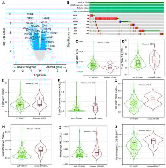 Vascular endothelial growth factor-α (VEGFA)/beta catenin (CTNNB1)/matrix metalloproteinase (MMP)-7/cluster of differentiation 44 (CD44) oncogenes were altered and amplified in colorectal cancer (CRC). (A) volcano plot showing upregulated genes in CRC altered and unaltered cohorts (B) Oncoprint analysis showed amplification (marked with *) of VEGFA/CTNNB1/MMP7/CD44 based on percentages of separate genes, with GSK3β (2%), MYC (9%), CTNNB1 (4%), MMP7 (2.4%), CD44 (2.2%), KRAS (9%), and VEGFA (2.4%) in CRC. (C–J) Mutation frequency of VEGFA/CTNNB1/MMP7/CD44 Genes shown by the violin plots of immune infiltration distribution including CD4+ T-cells, CD8+ T-cells, and macrophages in the wild-type compared to mutant tumors.