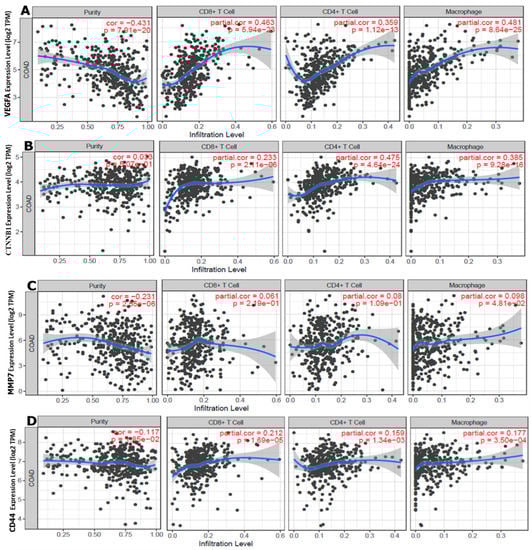 Correlation of vascular endothelial growth factor-α (VEGFA)/beta catenin (CTNNB1)/matrix metalloproteinase (MMP7)/cluster of differentiation 44 (CD44) expression with immune infiltrating cells in (COAD). (A) VEGFA, (B) CTNNB1, (C) MMP7, (D) CD44, and expression levels display associations with tumor purity and were positively correlated with lower infiltrating levels of CD8+ T cells and CD4+ cells, and a high infiltration level of M2 macrophages. The infiltration level was compared to the normal level using a two-sided Wilcoxon rank-sum test; p values of <0.05 were deemed significant.