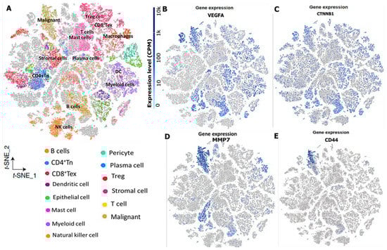 We explored publicly available scRNA-seq datasets and single-cell RNA sequencing (scRNA-seq) datasets of CRC, which included the M-E-MAT-8410 and (9 patients; GSE144735) CRC tumors, and we also matched adjacent normal colon tissue for the purpose of generating a cellular map of CRC and their tumor microenvironment [81]. Within the CRC, a distinct population of malignant cells and multi-lineages revealed the presence of abundant immune cells within the tumor microenvironment (TME), as compared to stromal and malignant cells. Herein, we focused on cell types that were described as a putative population. Interestingly, we identified distinct populations of regulatory T cells, mast cells, macrophages, and myeloid cells; low expression levels of CD4+Tc and CD8+Tc cells; and exhausted CD8 T cells with the TME of CRC patients (Figure 9A). When observing the expressions of significantly regulated genes, which associates with the immune landscape of CRC based on similarities with the control, we found VEGFA, CTNNB1, MMP7, and CD44 to be overexpressed by the majority in the malignant cells. For further analysis, merging expression patterns revealed distinct TME subpopulation with a high abundance of VEGFA, CTNNB1, MMP7, and CD44 in regulatory T cells, mast cells, macrophages, myeloid cells; a low expression level of CD4+Tc and CD8+Tc cells; and exhausted CD8 T cells with the TME of CRC patients (Figure 9B–E).