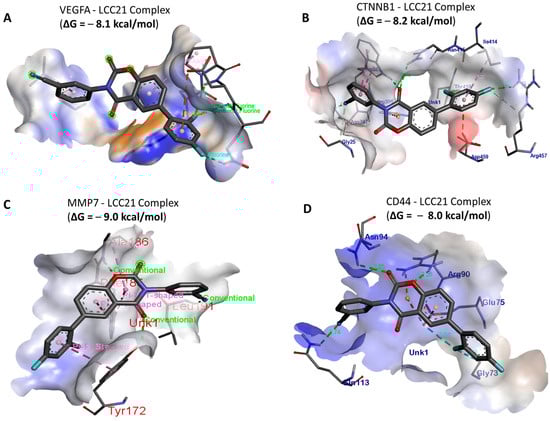 LCC-21 was shown to be a potential small-molecule inhibitor of multi-oncogenic proteins. (A–D) 3D structures of Vascular endothelial growth factor-α (VEGFA)/beta catenin (CTNNB1)/matrix metalloproteinase (MMP)-7/cluster of differentiation 44 (CD44) oncogenes-interactions (left) in complex with LCC-21, with the highest respective Gibbs free binding energies of (−(Δ = −8.1, −8.2, −9.0, and −8.0 kcal/mol).
