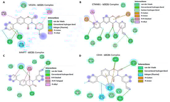 Two-dimensional (2D) structural analysis using Discovery Studio showing (A–D) ligand–receptor interactions between the atoms involved in H-bonding, amino acids and bond distances, van der Waals forces, carbon hydrogen bonds, and pi–pi interactions, with their respective amino acid of VEGFA/CTNNB1/MMP7/CD44-LCC-21 complexes using Discovery Studio (right). Table 2 summary of ligand–receptor interactions with their respective amino acids.