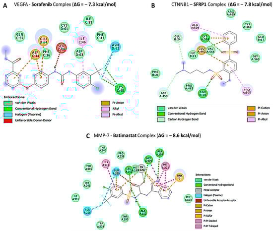 Two-dimensional (2D) structural analysis of sorafenib, SFRP-1, and batimastat in complex with VEGFA, CTNNB1, and MMP7 (A–C), respectively.