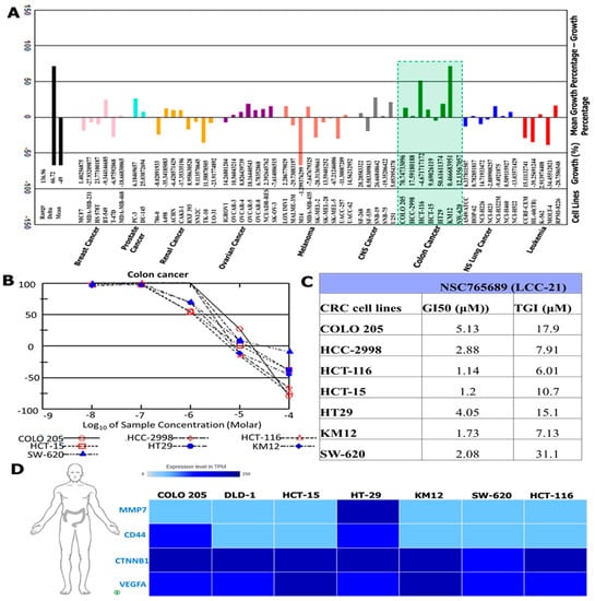 NSC765689 (LCC-21) demonstrates anticancer activities on colon cancer cell lines. (A) An initial 10 µM single-dose treatment displayed anti-cancer effects of LCC-21 on colon cancer cell lines. (B,C) LCC-21 was able to effect 50% growth inhibition (GI50) and tumor growth inhibition (TGI) at dose-dependent treatment. (D) Overexpression of VEGF-A, CTNNB1, CD44, and MMP7 genes in different colon cancer cell lines.