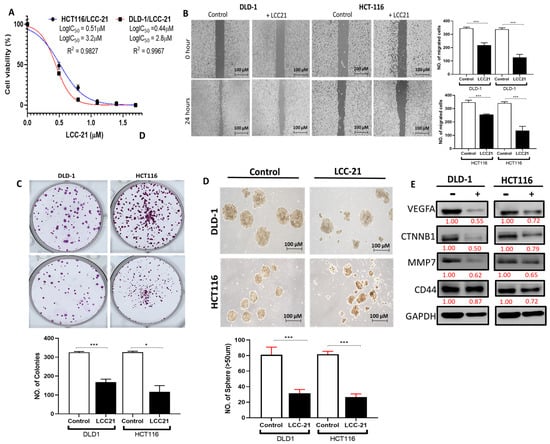LCC-21 treatment suppressed the viability of colorectal cancer (CRC). (A) A cell viability assay demonstrated that LCC-21 effectively decreased the cell viability of CRC cell lines in dose-dependent and time-dependent manners. The experiments were performed three times, each with three replicates at each concentration The 50% inhibitory concentration (IC50) values in the two cell lines (HCT116 and DLD-1) are indicated. (B–D) LCC-21 inhibited migration, colony, and sphere formation by DLD-1 and HCT116 cells. Images of the colony and spheroids are shown in the left upper panel, with quantification of the results in the right panel. (E) Western blot analysis shows that the LCC-21 significantly suppressed expression levels of vascular endothelial growth factor-α (VEGFA)/beta catenin, (CTNNB1)/matrix metalloproteinase, (MMP)-7/cluster of differentiation 44 (CD44), compared to the untreated group. GAPDH was used as an internal control. * p < 0.05, *** p < 0.01.