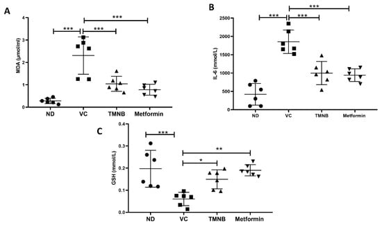 3.5. The Effect of 2′,3,3,5′-Tetramethyl-4′-Nitro-2′H-1,3′-Bipyrazole (TMNB) on MDA, GSH, and IL-6