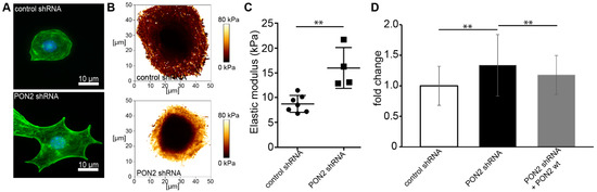 It is well known that glucose exposure induces ROS and leads to cytoskeletal rearrangement in podocytes [32,33,34]. Several studies reported increased cell stiffness in various cell types in diabetes [35,36,37]. Cytoskeletal architecture and cortical stiffness were assessed in differentiated stable mouse podocytes cell lines carrying lentiviral PON2 shRNA or control shRNA. The validation of PON2 knockdown and re-expression of PON2 wt is shown in Figure S1A. PON2-deficient podocytes show pronounced cortical actin distribution and pointed protrusions on cell margins as visualized by phalloidin staining (Figure 1A). Lower magnification views are provided in Figure S1B. Similar phenotypes can be observed in cultured podocytes treated with high glucose concentrations. To investigate cell stiffness of PON2-proficient and PON2-deficient podocytes, stable murine podocyte cell lines expressing PON2 specific shRNA or control shRNA were subjected to atomic force microscopy indentation measurements. Locally resolved stiffness maps show increased cell stiffness in PON2-deficient cells (Figure 1B,C). As compared to control shRNA expressing cells, PON2-deficient podocytes displayed increased cortical stiffness. The phenotype could be partially rescued by the stable re-expression of PON2 wildtype (Figure 1D).