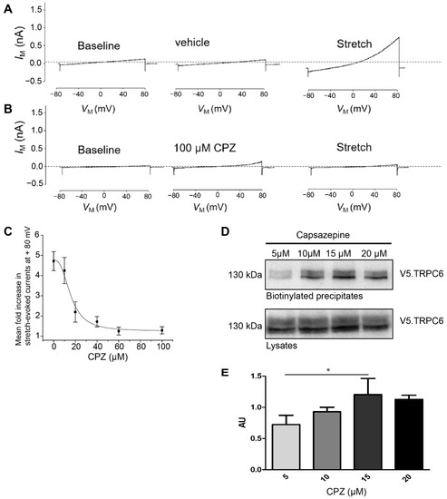 To test whether capsazepine affects TRPC6 membrane abundance, surface biotinylation experiments were performed after transient overexpression of V5-tagged TRPC6 in HEK293T cells and treatment with increasing doses of capsazepine (Figure 4D,E). A concentration-dependent increase in cell surface expression of TRPC6 was noted in the concentration range from 5 to 15 µM capsazepine (one-way ANOVA 0.023; AU 5 vs. 15 µM p < 0.05) (Figure 4D). At higher concentrations, e.g., 20 µM capsazepine, there was a trend toward reduced TRPC6 surface expression, but this effect did not reach statistical significance.