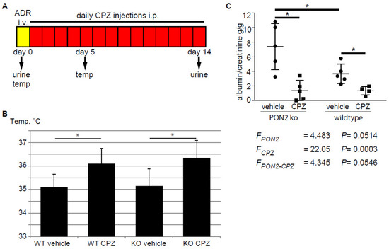 Daily administration of capsazepine reduces albuminuria in PON2-deficient and PON2-proficient mice during adriamycin-induced nephrosis. (A) Schematic representation of the in vivo protocol. After i.v. injection of adriamycin (ADR), mice were treated for 14 days with daily i.p. administration of capsazepine. Urine samples were collected on days 0 and 14 and body temperature was measured on days 0 and 5. (B) Body temperature was significantly increased in capsazepine-treated animals, measured after 5 days. Asterisks indicate * p < 0.05 by unpaired t-test. (C) Urine albumin/creatinine ratio at day 14 was significantly reduced in capsazepine-treated mice compared to vehicle-treated controls. This occurred in both PON2-proficient and PON2-deficient animals. Asterisks indicate * p < 0.05 by unpaired t-test. 2-way ANOVA shows differences of means for capsazepine treatment (FCPZ), a strong trend toward differences of means for PON2 (FPON2), and an interaction effect of both categorical variables (FPON2-CPZ).