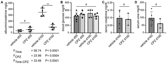 The albumin/creatinine ratio was significantly reduced in the capsazepine-treated animals as compared to vehicle-treated mice (102 mg/g vs. 347 mg/g; p < 0.01) (Figure 6A). The statistical analysis using 2-way ANOVA yielded clear differences of means for animal age (FTime) and capsazepine treatment (FCPZ), as well as a clear interaction effect of the two categorical variables. The blood glucose levels were increased in both groups at study entry and remained elevated without significant differences between groups until day 100 (Figure 6B). The serum creatinine and serum urea levels showed no significant differences between CPZ-treated and vehicle-treated animals at the end of the study (Figure 6C,D).