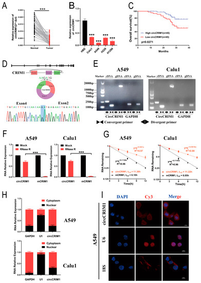 In addition, the RNase R digestion assay and Actinomycin D assay demonstrated that circCRIM1 was more resistant and had a longer half-life in contrast to the CRIM1 mRNA in A549 and Calu1 cells, indicating that circCRIM1 was more stable (Figure 1F,G). According to nuclear and cytoplasmic fraction assays and the RNA fluorescence in situ hybridization (FISH) assay, circCRIM1 was predominantly localized in the cytoplasm (Figure 1H,I and Figure S1C). Collectively, these results demonstrated that circCRIM1 was more stable in circular form and was mainly distributed in the cytoplasm.