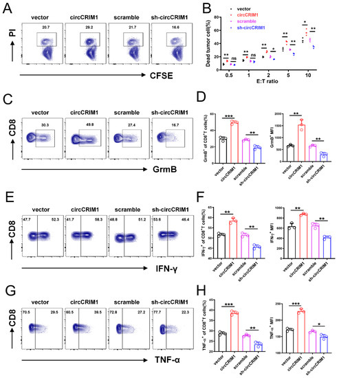CircCRIM1 inhibits the immune evasion of lung cancer cells from the killing of CD8+ T cells. (A) A549 cells that were stably transfected with vector, sh-circCRIM1#2, and circCRIM1, and co-cultured with activated CD8+T cell for 24 h. E:T ratio (effector to target cell ratio) = 2:1. (B) Flow cytometry analysis displaying the percentage of dead tumor cells in co-culture assays with different E:T ratios. Statistical analysis by unpaired t-test. (C–H) Flow cytometry analysis of Granzyme B, IFN-γ, and TNF-α expression of CD8+ T cells co-cultured with A549 cells for 24 h. E:T ratio = 2:1. Statistical analysis by one-way ANOVA. Data shown as mean ± SD; ns, not significant; * p < 0.05, ** p < 0.01, *** p < 0.001.
