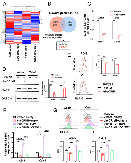 Next, we sought to investigate the molecular mechanism of regulating immune evasion underlying the role of circCRIM1 interaction with IGF2BP1 in NSCLC. RNA sequencing was performed, and the results revealed that 229 and 212 mRNAs were downregulated in overexpressed circCRIM1 A549 and Calu1 cells, respectively, compared with the vector. (Figure 4A,B). Among these differentially expressed mRNAs, only HLA-F was an immune-related gene and downregulated in both A549 and Calu1 cells (Figure 4B). Further qRT-PCR, Western blot, and flow cytometry assays confirmed that overexpressed circCRIM1 could reduce the expression levels of HLA-F (Figure 4C–E). Thus, the results of rescue experiments showed that IGF2BP1 significantly rescued the increased expression of HLA-F mediated by circCRIM1 in A549 and Calu1 cells, which demonstrated the interplay between circCRIM1 and IGF2BP1 in regulating the expression of HLA-F (Figure 4F,G and Figure S4A–C).