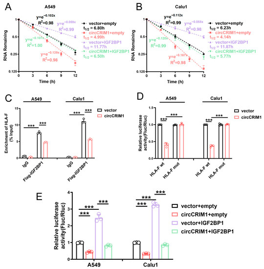 CircCRIM1 affects the mRNA stability of HLA-F via competing interactions with IGF2BP1 in NSCLC. (A,B) The relative RNA levels of HLA-F mRNA were analyzed via qRT-PCR and the mRNA half-life was calculated after treatment with actinomycin D at the indicated time points in A549 and Calu1 cells stably transfected with vector or circCRIM1, and co-transfected with IGF2BP1 or empty vector. Data expressed as mean ± SD of three independent experiments. (C) RIP-qPCR showed endogenous IGF2BP1 or recombinant IGF2BP1 binding to HLA-F transcripts in A549 and Calu1 cells stably transfected with vector or circCRIM1. Statistical analysis by one-way ANOVA. (D) Relative luciferase activity of wild-type (HLA-F wt) or binding site mutant (HLA-F mut) HLA-F mRNA reporters in A549 cells, with or without ectopic expression of circCRIM1. Statistical analysis by one-way ANOVA. (E) Relative luciferase activity of HLA-F mRNA in A549 and Calu1 cells stably transfected with vector or circCRIM1, and co-transfected with IGF2BP1 or empty vector. Statistics by one-way ANOVA with Tukey’s multiple comparison analysis. Data shown as mean ± SD; ns, not significant; *** p < 0.001.