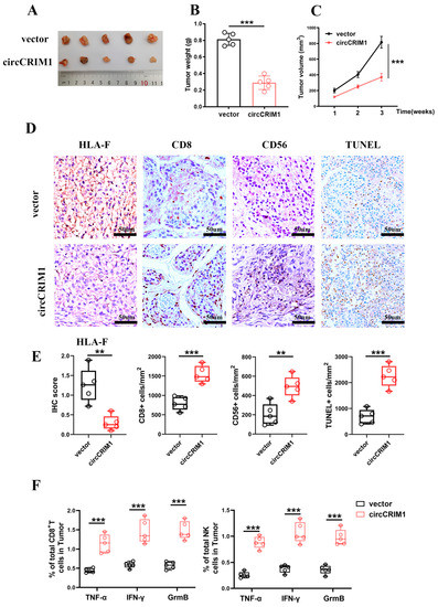 Biological implications of circCRIM1 in NSCLC. (A–C) The volume and weight of subcutaneous xenograft tumors (n = 5 mice per group). Statistical analysis by unpaired t-test (B) and two-way ANOVA (C). (D,E) Representative images of immunohistochemical images of HLA-F, CD8, and CD56, and TUNEL staining on the tumor tissues from xenografts mice subcutaneously injected with A549 cells stably transfected with vector or circCRIM1. Boxplots showing the IHC scores for HLA-F and the percentage of positive cells for CD8, CD56, and TUNEL. Statistical analysis by unpaired t-test (E). (F) Boxplots of representative flow cytometric analysis displaying the absolute percentages of Granzyme B, IFN-γ and TNF-α positive CD8+ T cells and NK cells in the tumor. Statistical analysis by unpaired t-test. Data shown as mean ± SD; ** p < 0.01, *** p < 0.001.