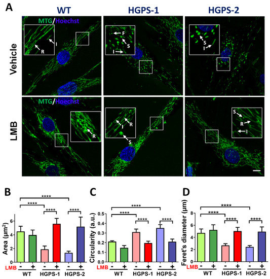 To ascertain whether the LMB-driven pharmacological modulation of CRM1 improves mitochondrial morphology in HGPS cells, WT, HGPS-1 and HGPS-2 fibroblasts were treated with LMB or the vehicle alone for 3 days. Cells were synchronized at the G0/G1 phase because mitochondrial morphology changes during cell cycle progression [23]. Afterwards, cells were incubated with MitoTracker Green dye (MTG), which stains mitochondria regardless of the mitochondrial membrane potential (ΔΨm) in living cells, to evaluate their morphology. Most WT fibroblasts exhibited mitochondrial reticular networks with long tubules, while HGPS fibroblasts contained numerous short intermediate mitochondrial tubules and fragmented and swollen mitochondria, which likely correspond to damaged mitochondria (Figure 1A).
