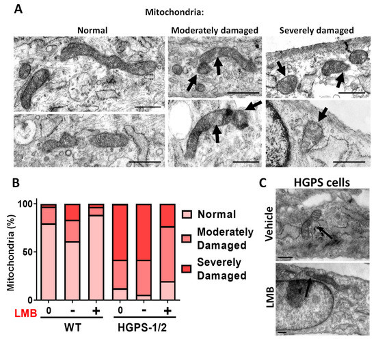 Remarkably, the use of LMB on WT cells clearly improved the mitochondrial morphology ratios as compared to vehicle-treated cells: normal (88%), moderate (8%), and severely (3%) damaged mitochondria. On the other hand, most HGPS 1–2 cells had both moderate damaged mitochondria, defined by tubular morphology with a disrupted double membrane and the presence of inclusions in the matrix, and severe damaged mitochondria, characterized by fragmented and swollen mitochondria with internal aggregates and total disruption of the cristae membrane (Figure 2A,B). Remarkably, HGPS 1–2 cells after LMB treatment showed a significant decrease in the number of severely damaged mitochondria (from 58% to 23%) with the corresponding increase of mitochondria with normal (from 5% to 19%) or moderate-damaged morphology (from 36% to 56%) (Figure 2B).