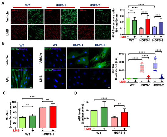 Mitochondrial morphology is closely related to their bioenergetics activity [25]. We were then prompted to ascertain whether LMB-mediated restoration of mitochondrial morphology after LMB treatment is reflected in an improvement in their function by measuring different mitochondrial parameters. The mitochondrial membrane potential (ΔΨm) was evaluated by staining cells with JC-1, a fluorescent dye that accumulates in the mitochondria of living cells in a concentration-dependent manner. Functional mitochondria form JC-1 aggregates that display excitation and emission in the red spectrum (590 nm), while defective/depolarized mitochondria are unable to form JC-1 aggregates and JC-1 dye monomers show excitation and emission in the green spectrum (529 nm). Thus, the red/green fluorescence intensity ratio of JC-1 is a suitable measure for the mitochondrial polarization state [26]. As a positive control, WT cells were incubated with carbonyl cyanide 4-(trifluoromethoxy)phenylhydrazone (FCCP), an uncoupling agent for oxidative phosphorylation. As expected, a low 590 nm/529 nm fluorescence ratio was found upon the exposure of WT cells to FCCP, which implies the loss of ΔΨm (Supplementary Figure S1A). On the other hand, HGPS-1 and HGPS-2 cells showed a drastic decrease of the JC-1 590 nm/529 nm fluorescence ratio, compared with WT cells, indicating the presence of mitochondria with disrupted ΔΨm (Figure 3A). Interestingly, treatment with LMB significantly restored the ΔΨm of HGPS-1 and HGPS-2, as shown by their increased 590 nm/529 nm fluorescence ratio, compared with vehicle-treated HGPS cells (Figure 3A). WT cells instead showed no changes in ΔΨm in response to LMB. As oxidative stress produced by reactive oxygen species (ROS) is a determinant of ΔΨm depolarization [27], we next analyzed whether the beneficial effect of LMB on HGPS cells is ultimately reflected in ROS levels. The generation of intracellular ROS was visualized by confocal microscopy using the cell permeable ROS-sensitive fluorescence dye H2DCFDA. As a positive control, WT cells were incubated with hydrogen peroxide (H2O2) to test H2DCFDA sensitivity to detect intracellular ROS. High intensity of H2DCFDA fluorescence was observed inside the H2O2-treated WT cells, while untreated WT cells showed no perceptible fluorescence (Figure 3B, left panel), which demonstrated the feasibility of H2DCFDA to detect ROS. Significantly higher levels of ROS-dependent H2DCFDA fluorescence was found in HGPS-1 and HGPS-2 cells, compared with WT cells (Figure 3B, middle panels); remarkably, the intensity of H2DCFDA fluorescence virtually disappeared in LMB-treated HGPS-1 and HGPS-2 cells (Figure 3B, middle panels). A quantitative analysis showed that H2DCFDA fluorescence was clearly absent in LMB-treated HGPS cells as observed in the WT cells (Figure 3, right panel). Since H2DCFHDA mainly detect the NADPH-oxidases-mediated cytoplasmic ROS (ROS derived from peroxisomes, endoplasmic reticulum, cell membrane ROS and phagocytes) [28,29], these results imply that treatment with LMB prevented their accumulation in HGPS cells. Next, we ascertained whether LMB has an effect on the ROS generated in mitochondria using MitoSox staining and further quantification by flow cytometry. WT and HGPS-1 cells were stained with two different MitoSox concentrations, so we choose the 1 µM concentration in order to avoid side effects [30] and high noise (Supplementary Figure S1B). As previously reported [16,20], increased mitochondrial superoxide production was observed in HGPS cells; nonetheless, the level of mitochondrial ROS remained unchanged after treatment with LMB in both WT and HGPS-1 cell cultures (Figure 3C). Finally, the synthesis of ATP was evaluated in HGPS-1 cells using a luminescent ATP detection assay. The significant decrease in ATP levels showed by HGPS-1 cells was prevented by LMB treatment (Figure 3D). Overall, these findings imply that the impairment of mitochondrial function exhibited by HGPS cells is rescued via the pharmacological modulation of CRM1.