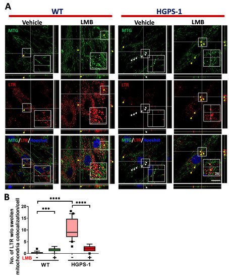 The lack of colocalization of lysosomes with swollen mitochondria in HGPS-1 cells is alleviated by exposure to LMB. (A) WT and HGPS-1 fibroblasts were grown on coverslips and incubated with 1 nM LMB or the vehicle alone for 3 days prior to being subjected to cell live analysis. Cells were simultaneously stained with Lysotracker, MTG and Hoechst to visualize the lysosomes, mitochondria, and nuclei, respectively. Typical orthogonal views of the images from three separate experiments are shown. Yellow arrows point at the colocalization between swollen mitochondria and lysosomes, and white arrows point at swollen mitochondria (w/o) colocalization with lysosomes; scale bar 10 µm. (B) The number of swollen mitochondria not colocalized with lysosomes was quantified from three independent experiments. Data is shown on a box and whiskers graph (percentile: 10–90, n = 60 cells per condition). The p values denoted significant differences (nonparametric Mann–Whitney test; *** p < 0.001; **** p < 0.0001).