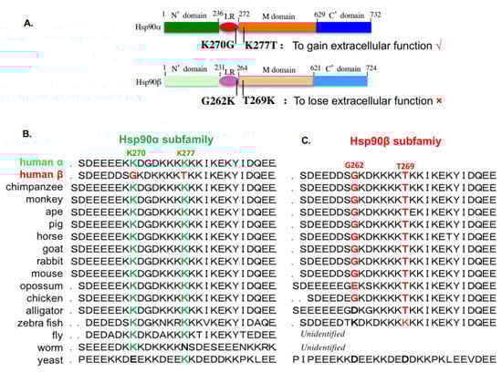 Evolutionarily conserved lys-270 and lys-277 distinguish Hsp90α from Hsp90β for having important extracellular functions. (A) The dual lysine motif is essential for the extracellular and ATPase-independent functions of eHsp90α. Substitutions of G262 and T269 in Hsp90β with lysine grant Hsp90β similar extracellular functions to eHsp90α. The dual K270/K277 motif in human Hsp90α (B) and the corresponding G262/T260 motif in human Hsp90β (C) are evolutionarily conserved in all the Hsp90α subfamily and the Hsp90β subfamily members, respectively.