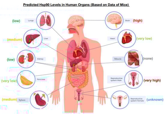 The relative Hsp90 levels in different organs based on studies in mice. Assuming that the profiles of Hsp90 expression in different organs of mice and humans are compatible, the relative levels in various human organs are predicted based on anti-(pan) Hsp90 antibody western immunoblotting data of mouse organs. (1) none: undetectable; (2) very low: weakly detectable; (3) low: visible; (4) medium: standard intensity; (5) high: strong intensity; and (6) very high: overexposed intensity. The image of human anatomy was taken and modified from Human Health UK (https://homehealth-uk.com/malebodydiagram/, accessed on 1 December 2022).