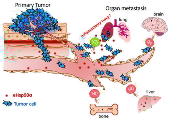 The five recognized common steps of cancer development include gene mutations, hyperplasia, dysplasia, primary tumor formation and tumor metastasis [59,60,61,62]. While most cancer patients die from cancer cell metastasis, the majority of the United States Food and Drug Administration (FDA)-approved oncology drugs (>1000 by end of 2021) target the primary tumors [63]. These drugs extend patients’ survival for variable periods of time, but gradually lose efficacy following as short as several months of treatment due to new mutations in the tumors. Accordingly, the cost of developing this kind of anti-cancer therapeutics has not always been justifiable from a business perspective. In theory, unlike drugs targeting primary tumors, drugs targeting the metastasis-promoting factors could be broadly beneficial, since these factors are likely shared among different cancers but unlikely subject to mutations in a cancer-specific fashion. There is compelling evidence that the yet unidentified “metastasis-promoting factors” belong to stress response factors involved in tissue injury, inflammation, wound healing and angiogenesis in the host, but taken advantage of by tumors [59,62]. McAllister and Weinberg argued that cancer is a systemic disease, in which successful cancer metastasis is not only determined by the primary tumor and its immediate microenvironment (TME), but also by a patient’s other pre-existing pathological conditions [64]. For instance, Roy and colleagues reported that a significant increase in breast cancer-associated secondary metastasis to the lung and bone was observed in arthritic versus non-arthritic PyV MT mice, which correlated with increased pro-inflammatory cytokines [65]. Demicheli et al. reported that tumor recurrence dynamics does not depend on the site of metastasis; instead, the timing of recurrences is generated by factors influencing the metastatic development regardless of the seeded organ [66]. Thus, surgery to remove the primary tumor often terminates tumor dormancy, resulting in accelerated relapses [67]. Furthermore, Gupta et al. showed that, despite lacking ER expression, tumors arising following pregnancy required circulating estrogens for growth. Increasing the circulating estrogens promoted the formation and progression of ER-negative cancers, suggesting a novel mechanism by which estrogens promote the growth of ER-negative cancers [68]. In summary, the findings of these studies suggest that two combined chronic pathological conditions in the same cancer patients increase the success rate of tumor metastasis. The molecular basis for the chronic conditions is tissue inflammation, which could influence the favorability of the niche toward tumors. Indeed, patients with chronic inflammatory conditions are at a higher risk for cancer-associated mortality [69]. In addition, studies in the lung have shown that acute inflammatory responses concurrent with the experimental administration of tumor cells in the blood can promote metastatic development [70]. We speculate that eHsp90α could be a candidate for such a stress-responding factor involved in tumor metastasis. Tens of thousands of patients with all NIH-listed major types of cancers, including breast, lung, stomach, colon, liver, uterus, prostate, brain, pancreas, esophagus, blood, head and neck, and skin, have been shown to exhibit dramatically elevated plasma eHsp90α up to 10-fold over their healthy controls. The plasma Hsp90α levels closely correlate with the early-to-late stages of the cancers [71,72,73,74,75,76,77,78,79,80,81,82,83,84,85,86,87]. Likewise, patients with idiopathic pulmonary fibrosis (IPF), Crohn’s disease, psoriasis, chronic glomerulonephritis, amyotrophic lateral sclerosis, obesity, systemic sclerosis and diabetes, showed significantly increased plasma eHsp90α [87,88,89,90,91,92]. As illustrated in Figure 4, for instance, IPF-caused chronic inflammation could increase tumor metastasis to the lung. It is of great interest to investigate the hypothesis of cancer being “a systemic disease” and the participation of other chronic disorders in (successful) cancer metastasis, specifically, whether eHsp90α in the circulation of cancer patients with other chronic pathological conditions adds a critical contributor for cancer metastasis [49].