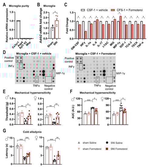 Spared nerve injury-induced induces upregulation of the Adrb2 mRNA in microglia, whereas β2-AR agonist decreases inflammation markers in activated primary microglia cell culture and sensitization in vivo. (A) Purity check of microglia isolated from the spinal dorsal horn via qPCR on markers specific for microglia (Cx3cr1), astrocytes (Aqp4), neurons (Syt1 V2), and oligodendrocytes (Mbp). n = 3. (B) Relative expression of Adrb2 mRNA in microglia isolated from the spinal dorsal horn of SNI- and sham-operated mice three days after surgery. n = 4–5/group; two-tailed unpaired t-test was performed; * p < 0.05 as compared between two groups. (C) Activated cultured microglia decrease the release of inflammatory mediators after Formoterol treatment. n = 4; two-tailed unpaired t-test was performed; * p < 0.05 as compared between two groups. (D) Examples of dot blots for inflammatory cytokines released from activated primary microglia culture (CSF-1 treated) after vehicle or Formoterol treatment. (E,F) Behavioral analysis of the effects of intraperitoneal Formoterol administration on mechanical sensitivity measured 1 h after intraperitoneal injection of Formoterol (E) in male (left, F1, 18 = 3.35, p = 0.0659) and female (right, F1, 18 = 6.184, p = 0.0229) mice. Integral of response frequency–von Frey force intensity (0.008 to 0.1 g) curves (AUC, A.U. = arbitrary unit) (F) three days after SNI or sham operation, using male (left; F1, 20 = 3.169; p = 0.0903) and female (right; F1, 18 = 5.561, p = 0.0299) mice. (G) Cold allodynia measured after Formoterol injection, three days after operation, using mice of both genders (male: F1, 20 = 8.808, p = 0.0076; female: F1, 18 = 4.913, p = 0.0398). n = 5–7/group; two-way ANOVA test; * p < 0.05, ** p < 0.01, *** p < 0.001. Data are expressed as mean ±  SEM, individual data points are displayed.