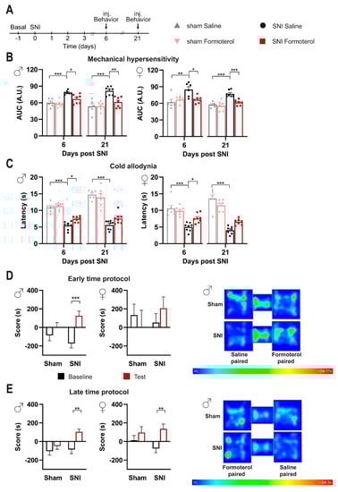 Impact of Formoterol on behavior in SNI- and sham-operated WT mice. Conditioned place preference test shows that Formoterol reduces spontaneous pain in SNI-operated mice. (A) Experimental scheme used for testing mechanical sensitivity (von Frey) and cold sensitivity (cold plate) at the plantar hind paw with 8-week-old mice. Inj. = injection. (B) Mechanical sensitivity was evaluated as integral of the response frequency-von Frey stimulus intensity from 0.008 to 1.0 g (AUC, A.U. = arbitrary unit) six and 21 days after operation in male (left; day 6: F1, 22 = 3.338, p = 0.0813; day 21: F1, 23 = 8.048, p = 0.0093) and female (right; day 6: F1, 21 = 9.356, p = 0.0060; day 21: F1, 21 = 7.224, p = 0.0138) mice, injected with saline or Formoterol. (C) Response to cold allodynia six and 21 days post-surgery is indicated as latency (s) of paw withdrawal for males (left; day 6: F1, 25 = 3.972, p = 0.0573, day 21: F1, 24 = 3.770, p = 0.0640) and female (right; day 6: F1, 26 = 7.740, p = 0.0099; day 21: F1, 22 = 10.98, p = 0.0032) mice. n = 6–8/group; two-way ANOVA test was performed. * p < 0.05, ** p < 0.01, *** p < 0.001. Data are expressed as mean ±  SEM, individual data points are displayed. (D) Conditioned place preference (CPP) was tested to Formoterol at 4 days post-SNI or sham surgery. Analysis of the time spent by operated male (left) or female (right) mice is shown in the Formoterol-paired chamber before (baseline) and after (test) the conditioning. Example of heat maps recorded on the test day. (E) CPP was tested to Formoterol at 32 days post-SNI or sham operation. Score = the time spent by operated male (left) or female (right) mice in the Formoterol-paired chamber on baseline and test day. Representative example of heat maps recorded on the test day. n = 6–7/sham group; n = 8/SNI group; two-tailed unpaired t-test was performed; ** p < 0.01, *** p < 0.001 as compared between Formoterol-paired chamber baseline and test daytime. Data are indicated as mean ±  SEM.