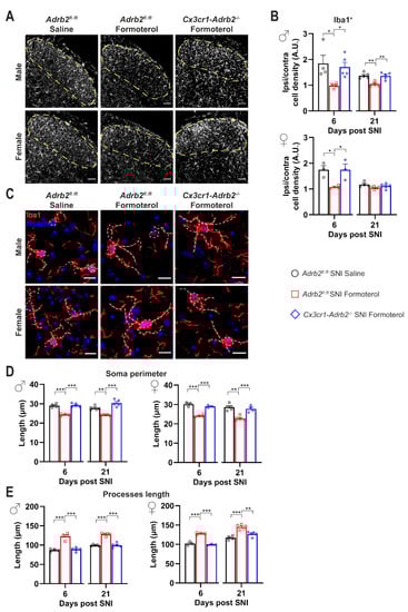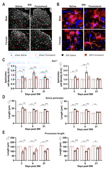 Given their role as resident immune cells in the central nervous system (CNS), microglial cells are highly sensitive to inflammatory mediators. In neuropathic pain conditions, several cell types produce a variety of pro-inflammatory substances, many of which can consequentially push microglia toward an inflammatory state []. We studied the impact of β2-AR activation on spinal cord microglia 3, 6 or 21 days after SNI by studying microglial density and morphological changes. The microglia density was analyzed as the density of Iba1-positive cells in the lamina I-III of the SDH (Figure 3A,C). Additionally, microgliosis is differentiated by shifts from ramified-homeostatic microglia towards ameboid phenotype (enlargement of soma and shortening of processes length). To describe the reactive state of microglia, we studied three hallmarks of microgliosis: density, soma perimeter, and process length (Figure 3). Since it is well known that there are sex differences in microglial contribution to the development and maintenance of neuropathic pain [], we parsed our analysis based on the sex of mice. We evaluated the ratio between ipsilateral and contralateral SDH, in SNI-operated mice treated with saline or Formoterol. Male mice demonstrated a significant increase in microglial density in the superficial layers of the ipsilateral SDH (marked in dashed lines in examples shown in Figure 3A) at both early and late stages post-SNI (Figure 3C), which was inhibited by Formoterol treatment. In female mice, increased microglial density in the superficial SDH was noted only over early stages post-SNI, which was reversed fully by Formoterol treatment (Figure 3A,B).