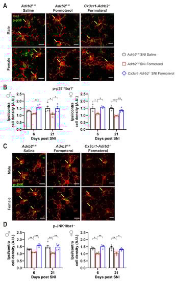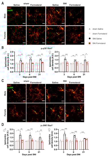 An increase in microglial density does not necessarily correspond to a reactive state of microglia. Hence, to investigate the effect of Formoterol treatment on microglia activation in neuropathic conditions, we performed co-localization analysis using Iba1 as a microglial marker and the active (i.e., phosphorylated) form of two different markers for activation: phosphorylated versions of the MAPKs p38 and JNK. Microglia are the main p38-expressing cells of the spinal cord []. JNK signaling modulates apoptosis and the level of pro-inflammatory cytokines, while p38 is involved in the development and maintenance of neuropathic nociceptive hypersensitivity via the induction of inflammatory mediators []. Immunoreactivity for phosphorylated p38 in Iba1-expressing microglia was significantly enhanced in male and female mice at early (3 days post-SNI) and late (21 days post-SNI) time points after SNI and was completely reversed by Formoterol treatment at all time points (Figure 4A,B). Phosphorylated JNK was enhanced in microglia of male and female mice at 3, 6 and 21 days post-SNI and was fully reversed by Formoterol in both cases except for female mice at 21 days after SNI operation (Figure 4C,D).