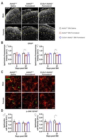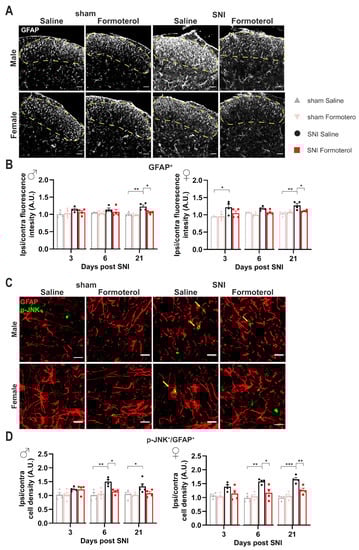 Astrocytes also express β2-AR; therefore, Formoterol might exert its analgesic effect through the activation of this receptor on astrocytes. Using the same experimental protocol, we studied the effect of β2-AR activation on astrocytes using Glial fibrillary acidic protein (GFAP) to identify astrocytes in combination with a classic activation marker, p-JNK. In both sexes, we observed a significant increase in GFAP signal intensity at late time points after nerve injury (21 d post-SNI) when neuropathic pain is fully developed, but not over early time points (Figure 5A,B). Interestingly, SNI-induced astrogliosis was partially, but significantly, inhibited by Formoterol in both sexes (Figure 5A,B).