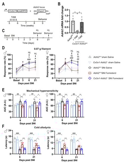 Effect of Formoterol on behavior in Cx3cr1-Adrb2-/- operated mice. (A) Schematic representation of the strategy for generation of mice lacking the Adrb2 gene conditionally in microglial cells in a tamoxifen-inducible manner. (B) Analysis via qPCR demonstrating the loss of Adrb2 mRNA expression in microglia cells three weeks after tamoxifen injection in the mouse line Cx3cr1-Adrb2fl/fl. The recombination does not occur in mice lacking the Cre-cassette (Adrb2fl/fl). TAM = Tamoxifen. n = 3–4/group; ordinary two-way ANOVA with main effects only was performed. * p < 0.05. (C) Experimental scheme for testing mechanical sensitivity (von Frey) and cold allodynia (cold plate) at the plantar hind paw with 8–9 weeks old mice. Inj. = injection. (D) Mechanical sensitivity is displayed as response frequency to the 0.07 g filament in male (left) and female (right) control mice (grey line for Adrb2fl/fl sham saline-injected mice; pink line for Cx3cr1-Adrb2-/- sham saline-injected mice black line for Adrb2fl/fl SNI saline-injected mice; red line for Adrb2fl/fl SNI Formoterol-injected mice) and Cx3cr1-Adrb2-/- transgenic mice (blue line) before the SNI operation (basal measurement), 3 days after surgery, and 6 and 21 days after the SNI, 1 hour after Formoterol injection. n = 5–8/group; t-test test was performed; § p < 0.05, §§ p < 0.01 as compared Cx3cr1-Adrb2-/- SNI Formoterol and Adrb2fl/fl SNI Formoterol; # p < 0.05, ## p < 0.01, ### p < 0.001 as compared Adrb2fl/fl SNI Saline and Adrb2fl/fl Sham Saline. (E) Mechanical sensitivity of the same groups as (D) shown as integral of the response frequency-von Frey stimulus intensity from 0.008 to 1.0 g (AUC, A.U. = arbitrary unit). (F) Cold sensitivity 6 and 21 days after SNI or sham surgery, after Formoterol or saline injection showed as latency (s) of paw withdrawal. n = 5–8/group; t-test test was performed; ## p < 0.01, ### p < 0.001 as compared Adrb2fl/fl sham saline and Adrb2fl/fl SNI saline; ordinary two-way ANOVA with main effects only was performed among Adrb2fl/fl SNI saline, Adrb2fl/fl SNI Formoterol, and Cx3cr1-Adrb2-/- SNI Formoterol; * p < 0.05, ** p < 0.01, *** p < 0.001. Data are expressed as mean ±  SEM, individual data points are exhibited.
