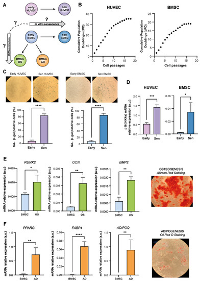 For the establishment of replicative senescence, BMSCs and HUVECs were cultured until they arrested their replication (approximatively around the 17th passage), and replicative senescence was assessed using Senescence-Associated (SA)-β-galactosidase and measuring the Population Doublings (PDs). PDs were calculated by the formula: (log10(F) − log10(I))/log10(2), where F is the number of cells at the end of the passage, and I is the number of seeded cells. Cumulative population doublings (cPD) were calculated as the sum of PD changes. HUVECs were considered at early passages for passages ≤6 and senescent at passage ≥16; BMSCs were considered young at passage ≤5 and senescent at passage ≥14.