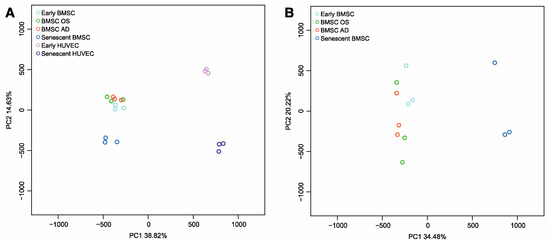 Principal Component Analysis (PCA) of DNAm values obtained by genome-wide analysis (A) in early and senescent HUVEC and in early, senescent, and differentiated BMSC samples, and (B) in early, senescent, and differentiated BMSC samples (n = three replicates per condition). The percentage of variance explained by the first and the second principal components is reported in X and Y axes, respectively.