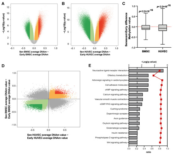 (A,B) Volcano plot showing differentially methylated CpGs (FDR < 0.05) in (A) Senescent (Sen) vs. early BMSCs and (B) Sen vs. early HUVECs. Differences in DNAm values are plotted against −log10(q-values). DMPs with an absolute DNAm difference >0.20 are highlighted in red (hypermethylated) and dark green (hypomethylated). (C) Boxplots showing the distribution of differences in the DNAm values of the CpGs between senescent and early BMSCs and HUVECs. p for Wilcoxon signed-rank tests. (D) Scatter plot comparing DNAm differences between Sen and early HUVECs and BMSCs. DMPs (FDR < 0.05) with concordant senescence-associated hypo- and hyper-methylation are indicated in green and red, respectively; DMPs with an absolute DNAm difference >0.20 are highlighted with darker green and red colors. (E) KEGG pathways significantly enriched in genes containing DMPs that are common to both cellular lineages in senescence. Pathways are ranked according to the significance of enrichment (grey bars, upper y-axis). Ratios referring to the proportion of targeted genes related to the total number of genes in each pathway are displayed (red line graph, bottom y-axis).