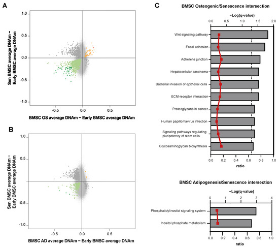 (A,B) Scatterplots comparing DNAm differences induced by (A) osteogenic (OS) and (B) adipogenic (AD) commitment vs. replicative senescence (Sen) of BMSCs. DMPs (FDR < 0.05) with hypo- and hyper-methylation in both the comparisons are indicated in green and red, respectively; DMPs with an absolute DNAm difference >0.20 are highlighted with darker green and red colors. (C) KEGG pathways significantly enriched in genes containing DMPs that are common between BMSC osteogenic (upper panel), adipogenic (lower panel) commitment, and replicative senescence. Pathways are ranked according to the significance of enrichment (grey bars, upper y-axis). Ratios referring to the proportion of targeted genes related to the total number of genes in each pathway are displayed (red line graph, bottom y-axis).