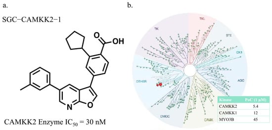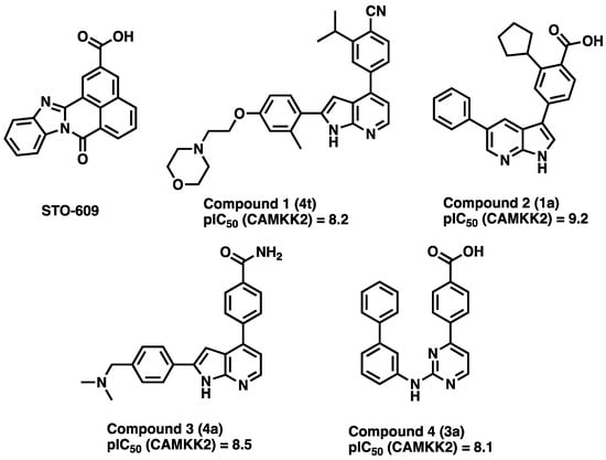 Kinases have been successfully targeted by medicinal chemistry programs to develop therapies for diseases, mostly directed towards oncology indications. Although there are over 60 approved small molecule inhibitors targeting kinases (https://brimr.org/protein-kinase-inhibitors/; accessed 9 January 2023), many of the >500 protein kinases have garnered little attention and have no published selective or potent inhibitors. CAMKK2 (Calcium/Calmodulin-Dependent Protein Kinase Kinase 2) is a kinase that is important in physiological process such as energy balance [] and many pathological processes (Table 1). For example, CAMKK2 activation has been linked to several types of cancers, metabolic diseases, and regulation of the immune response (Table 1). Despite having multiple links to disease, and thus a potential therapeutic target, there is only one tool molecule that is commercially available and in widespread use—STO-609 (Figure 1).