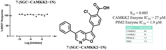 We next sought to develop a structurally related but CAMKK2-inactive compound to serve as a negative control []. Two minor modifications to the probe (5), removal of the methyl group from the 5-position aryl ring and replacement of the cyclopentyl moiety with a chloro resulted in negative control compound 7 (SGC-CAMKK2-1N). These changes rendered this compound significantly less potent with CAMKK2 IC50 = 27 µM (Figure 3). In the DiscoverX KinomeSCAN® assay panel, when screened at a concentration of 1 µM, compound 7 bound to very few kinases with S10 (1 µM) = 0.005. The only two kinases with significant binding for compound 7 were PIP4K2C with a PoC = 7.2 and PIM2 with PoC = 7.4. PIP4K2C is a lipid kinase that has very little catalytic activity [,,], and there is no commercially available kinase activity assay, so this potential off-target activity for the negative control remains uncharacterized. We evaluated the PIM2 inhibition of negative control compound 7 at Reaction Biology Corporation and it had an IC50 = 1.9 µM.