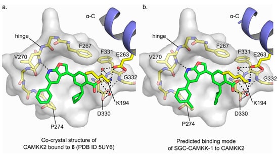 SGC-CAMKK2-1 was docked onto the available crystal structure of CAMKK2 bound to a similar furopyridine compound (13g from PMID: 34264658/PDB ID 5UY6) []. Co-crystal structure coordinates were downloaded from the Protein DataBank and prepared for docking using the protein preparation workflow in Maestro (Schrödinger. LLC, New York, NY, USA; version 13.0.137) using default settings []. Briefly, missing side chains for residues Glu277, Glu361, Arg363, and Glu439 were filled in (no atoms in these residues were <10 Å from the ligand); missing residues (214-221) were not filled in and protein termini were not capped; potential hydrogen bond assignments were optimized using PROPKA []; energy minimization was performed (heavy atoms were restrained with a harmonic potential of 25 kcal mol−1 Å−2; hydrogens were not restrained) using the OPLS4 force field; water molecules >5 Å from ligand atoms were deleted. The receptor grid was also generated in Maestro using default options. Briefly, van der Waals radius scaling factor was set to 1.0 and partial charge cutoff to 0.25; the docking box was limited to a 10 Å cube defined around the centroid of the ligand; grid-based constraints used were: hydrogen bond (main chain NH of Val270 and side chain NH of Lys194) and positional (defined as a 5 Å sphere around the ligand furopyridine moiety). The ligand (SGC-CAMKK2-1) was prepared for docking using LigPrep within Maestro using default settings. Briefly, the OPLS4 force field was used and possible protonation states were generated at pH 7.0 ± 2.0 using Epik. Docking of SGC-CAMKK2-1 onto CAMKK2 coordinates was performed using Glide within Maestro [] using default settings. Briefly, a van der Waals radii scaling factor of 0.8 and a partial charge cutoff of 0.15 was used; all three grid-based constraints (2x hydrogen bonds and 1x positional) as described above were enforced; docking was performed at extra precision (XP mode) with flexible ligand sampling (including nitrogen inversion and ring conformations); and Epik state penalties were added to the final docking score (−13.7565).