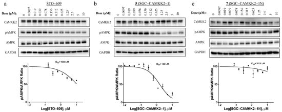 Western blot analysis of endogenous CAMKK2 inhibition using p-AMPK(Thr172) levels as a marker of CAMKK2 cellular activity. Western blot images (top) and densitometry analyses (bottom) of C4-2 cells treated with increasing doses of (a) STO-609, (b) probe SGC-CAMKK2-1 (5), and (c) negative control SGC-CAMKK2-1N (7). IC50 for STO-609 = 10.7 μM, SGC-CAMKK2-1 probe = 1.6 μM, and negative control SGC-CAMKK2-1N ≥10 μM. Results represent values from three individual experiments.