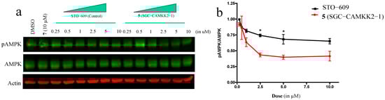 The probe compound SGC-CAMKK2-1 (5) inhibits CAMKK2 activity with higher efficacy than STO-609 in MDA-MB 231 triple-negative metastatic breast cancer cells. MDA-MB 231 cells were treated with increasing doses of STO-609 or 5 for 24 h as indicated. Compound 7 (10 μM) was used as the negative control for CAMKK2 inhibition (data not shown). Lysates were collected and immunoblotting was done to check for levels of p-AMPK(Thr172), a substrate of CAMKK2. (a) Representative image showing 5 inhibiting CAMKK2 downstream activity with improved efficacy compared to STO-609. (b) Quantification of immunoblot bands. Results represent values from three individual experiments. * p < 0.05.