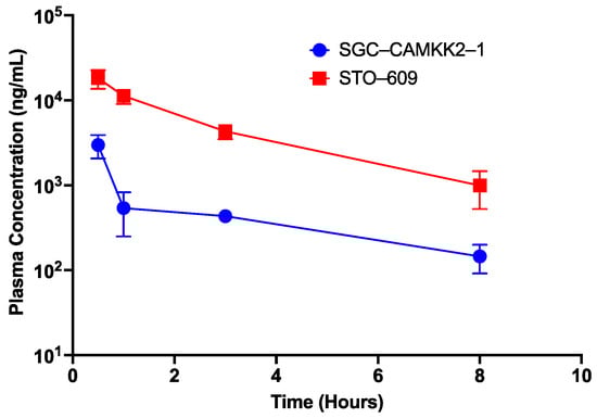 Plasma concentration of SGC-CAMKK2-1 and STO-609 in a single dose IP mouse study. The compounds were administered at a dose of 10 mg/kg via IP administration to three animals for each compound. Blood was collected at t = 0.5, 1, 3, and 8 h and immediately spun for 3 min and the plasma was collected, and compound levels were quantified with HPLC/MS.