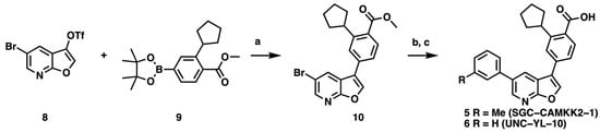 To address the lack of a highly selective CAMKK2 inhibitor and provide the community with an additional tool to cross-validate work done using STO-609, we initiated a medicinal chemistry campaign to identify and fully characterize a CAMKK2 chemical probe. We used compound 2 (Figure 1) from Price et al.[] as our chemical starting point, reasoning that we could improve the selectivity of this very potent starting point (pIC50 = 9.2). We hypothesized that modifying the pyrrolo [2,3-b]pyridine hinge-binding scaffold, common to many kinase inhibitors, would provide the best opportunity to increase selectivity. Our strategy to identify scaffolds with improved selectivity has been reported []. In short, modification of the hinge binder from the pyrrolo [2,3-b]pyridine to a furo [2,3-b]pyridine core provided the boost of selectivity needed. Furopyridine cores are less prevalent amongst literature kinase inhibitors, perhaps because they provide one less interaction with the hinge region of the kinase. We opted to maintain the benzoic acid that made a key interaction with the catalytic lysine in hopes that would aid in maintaining potency. The route we employed (Scheme 1, Supplemental S1) started with the 5-chlorofuro [2,3-b]8yridine-3-triflate (8). This route had been previously optimized by our group and provided a furopyridine core that could be quickly modified at both the 3- and 5-positions []. Compound 8 then underwent a Suzuki–Miyara reaction with 9 to preferentially install the cyclopentylbenzoic acid methyl ester at the 3-position (10). Having the chloro handle at the 5-position, we then performed a subsequent Suzuki–Miyara reaction with an aryl boronic acid to obtain the desired intermediates. Hydrolysis of the methyl ester to the carboxylic acid proceeded as expected to provide final compounds (5 and 6). The synthesis of the pinacol borane 9 was previously described [].